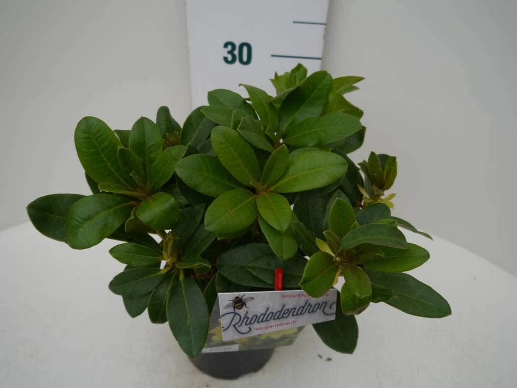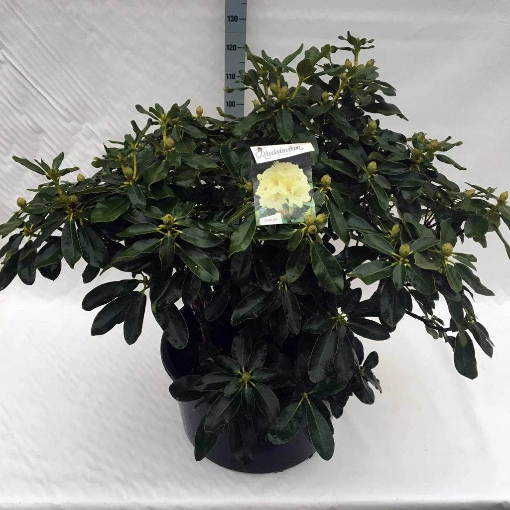 Doordat Rhododendrons vaak even hoog als breed worden, meten sommige kwekers de maat ook in de breedte.