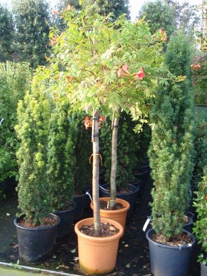 Campsis tagliabuana ‘Mme Galen’ is een Trompetbloem die als boomvorm is gekweekt!